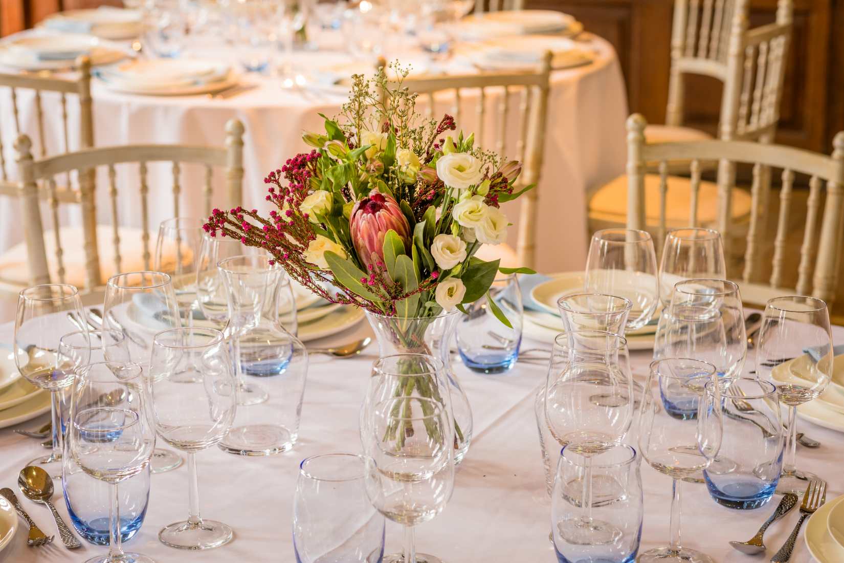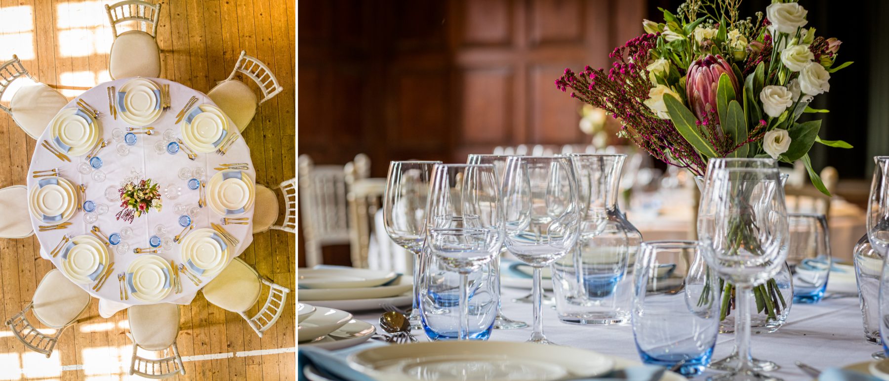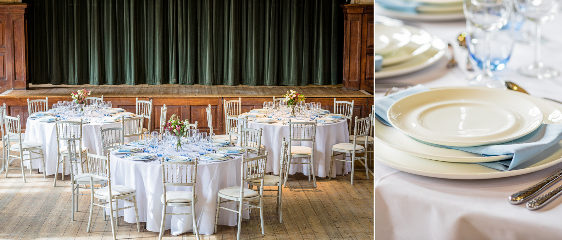 Firstly, we set up the Victory Hall for a wedding. We offset the dark tones of the wood panelled walls with light and airy linens including our Wedgewood napkins.