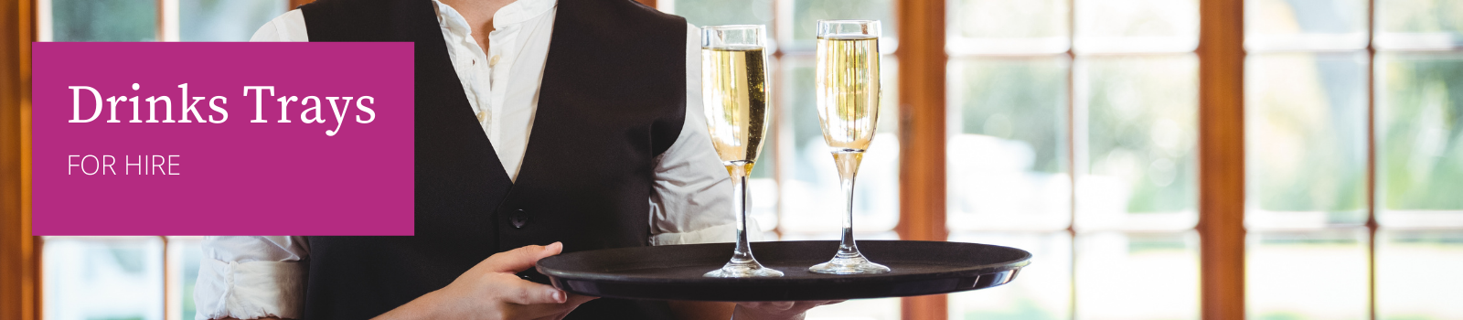 Our drinks tray range available for hire will suit any event, from weddings to charity fundraisers. Our collection includes traditional black non-slip trays, stainless steel trays and a range of contemporary rectangular trays.