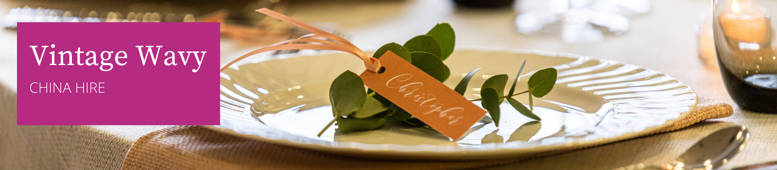 The Vintage Wavy china collection has a wave pattern to the rim, which is very pleasing to the eye. Perfect for a more traditional or vintage looking table. The vast hire range includes plates from side to charger in size, along with bowls, a gravy boat, a teacup and various shapes and size of jug.