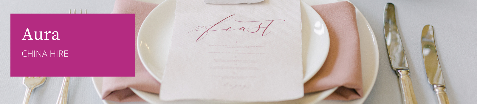 The newest of our china collections, the Aura is a stunningly beautiful bone china range. It’s unique, sleek and curvy rim is the perfect balance between modern and traditional. The hire range consists of side plate, starter plate, main plate and charger plate, as well as two different styles of bowl.