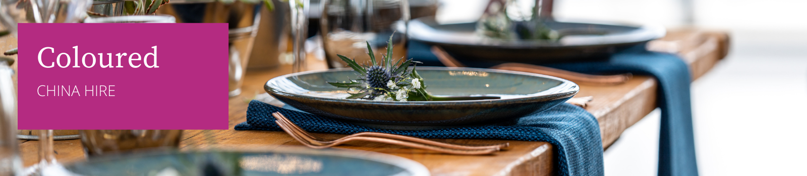 Our coloured china hire range has proven incredibly popular over recent years, with our colourful plates looking beautiful at both intimate formal functions and rustic event. We have seven different shades of our locally bought, handmade stoneware plates to choose from, which look wonderful when hired as a selection.