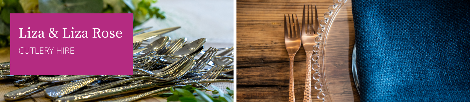 With it’s gorgeous hammered handle, our Liza range cutlery is an incredibly popular hire choice for weddings, parties and private dining experiences. Available in both a silver and a rose finish, this beautiful cutlery is a real statement piece. Available as in both a large and a small knife and fork as well as a dessert spoon and a tea spoon.