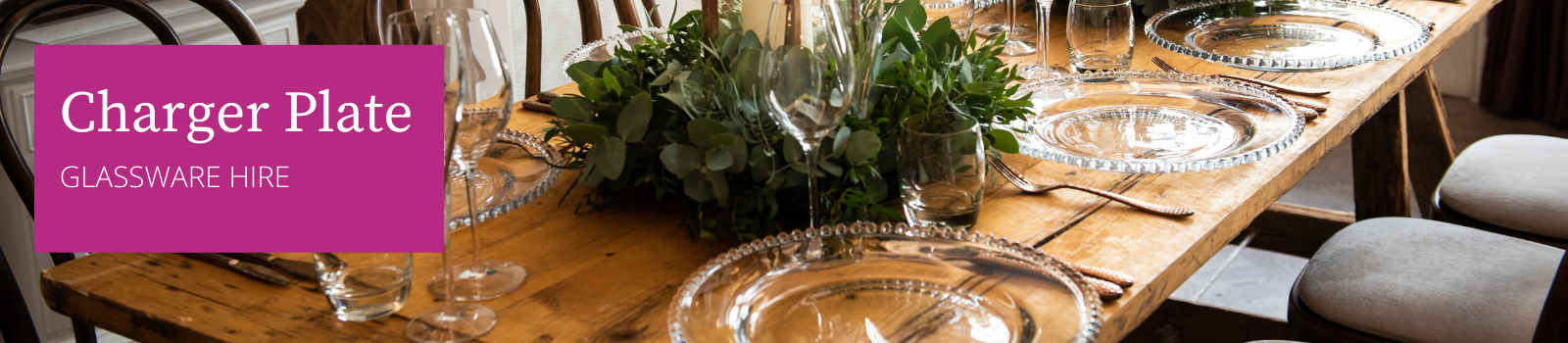 A glass charger plate is the perfect way to add an extra level of elegance to a table. We have both clear and coloured charger plates available for hire, perfect for a wedding or special dining event.