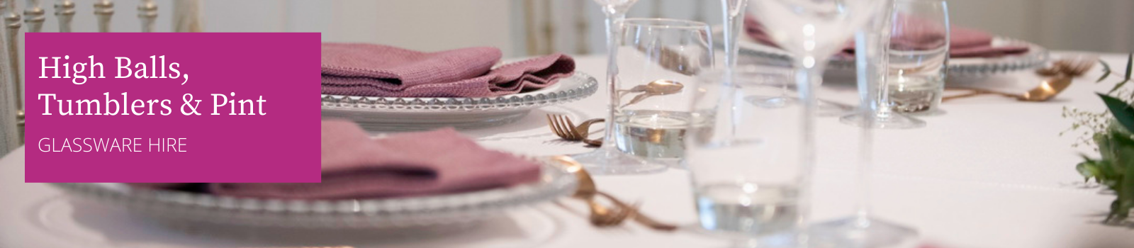 We have a wide range of traditional and functional glassware to hire, including high balls, tumblers and pint glasses. From Pimms to Pints, whether you are looking for glasses for welcome drinks or to set up a bar, we have the glassware for you.