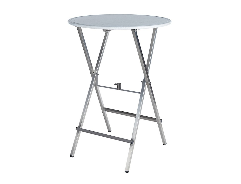 Our simple, folding poseur table has a speckled grey plastic top and measures 31″ in diameter, standing 43″ tall.
