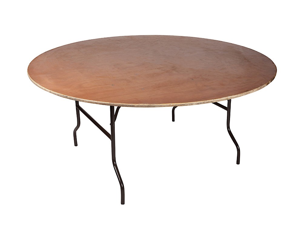 Round wooden tables with fold out legs. Perfect to hire for any event.