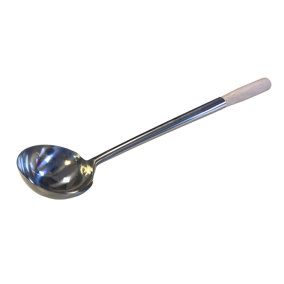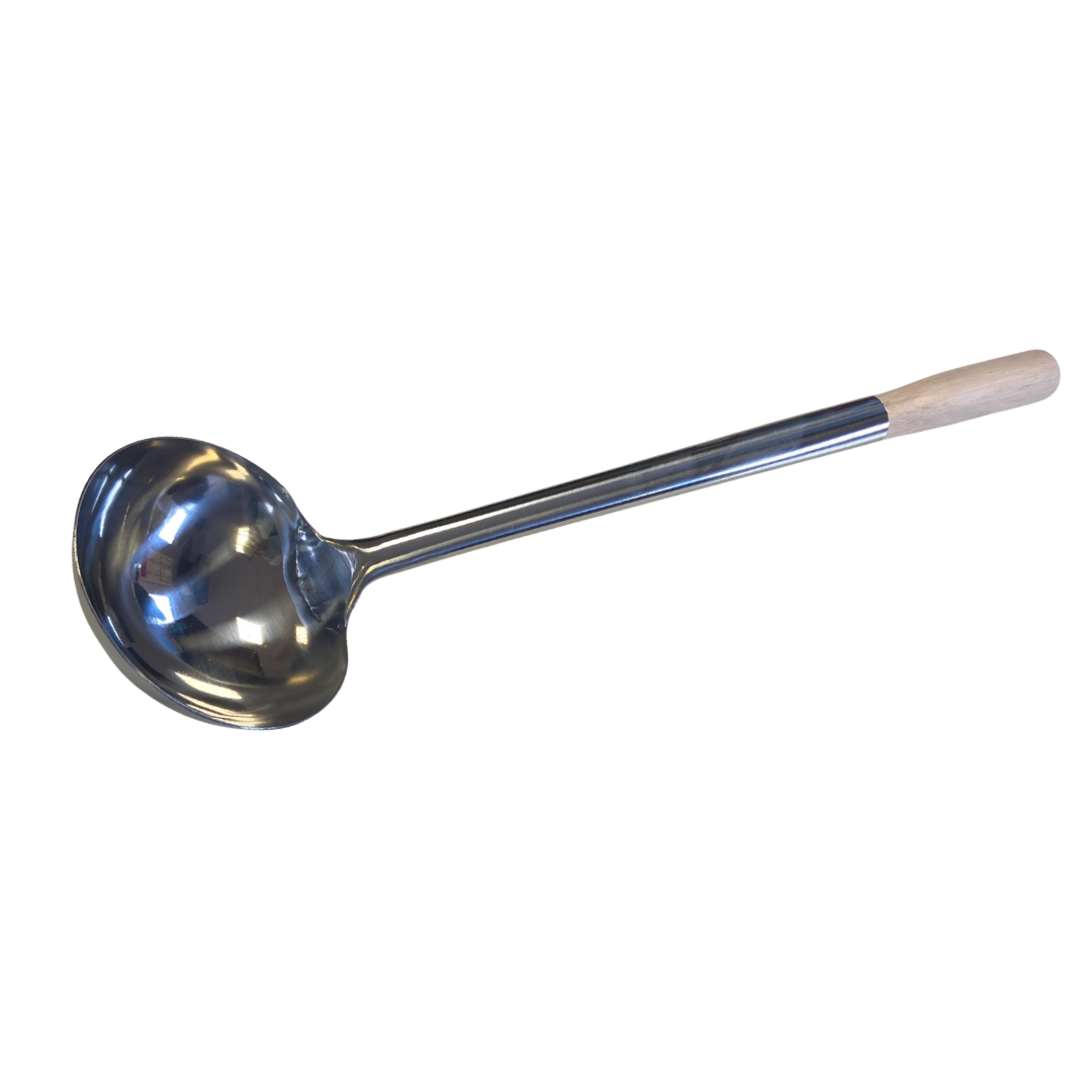 Serve soups, stews, and sauces with ease using this beautifully crafted stainless steel soup ladle. Designed for both durability and comfort, it features a deep, polished stainless steel bowl that scoops generous portions without spills. The long handle keeps your hands safely away from the heat, while the wooden grip stops the heat from reaching your hands.