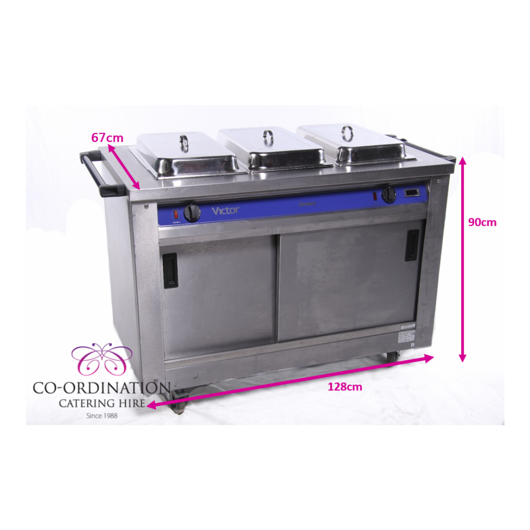 Versatile hot cupboard with a triple bain marie top, ideal for keeping dishes warm and ready to serve. Features three separate bain marie compartments with adjustable temperature controls and a spacious lower cupboard for additional storage. Perfect for catering, buffets, and busy food service environments. Specifications: 240 volts – 1,500 watts – 6.5 amps (13 amp fuse) – 1.43 KVA
