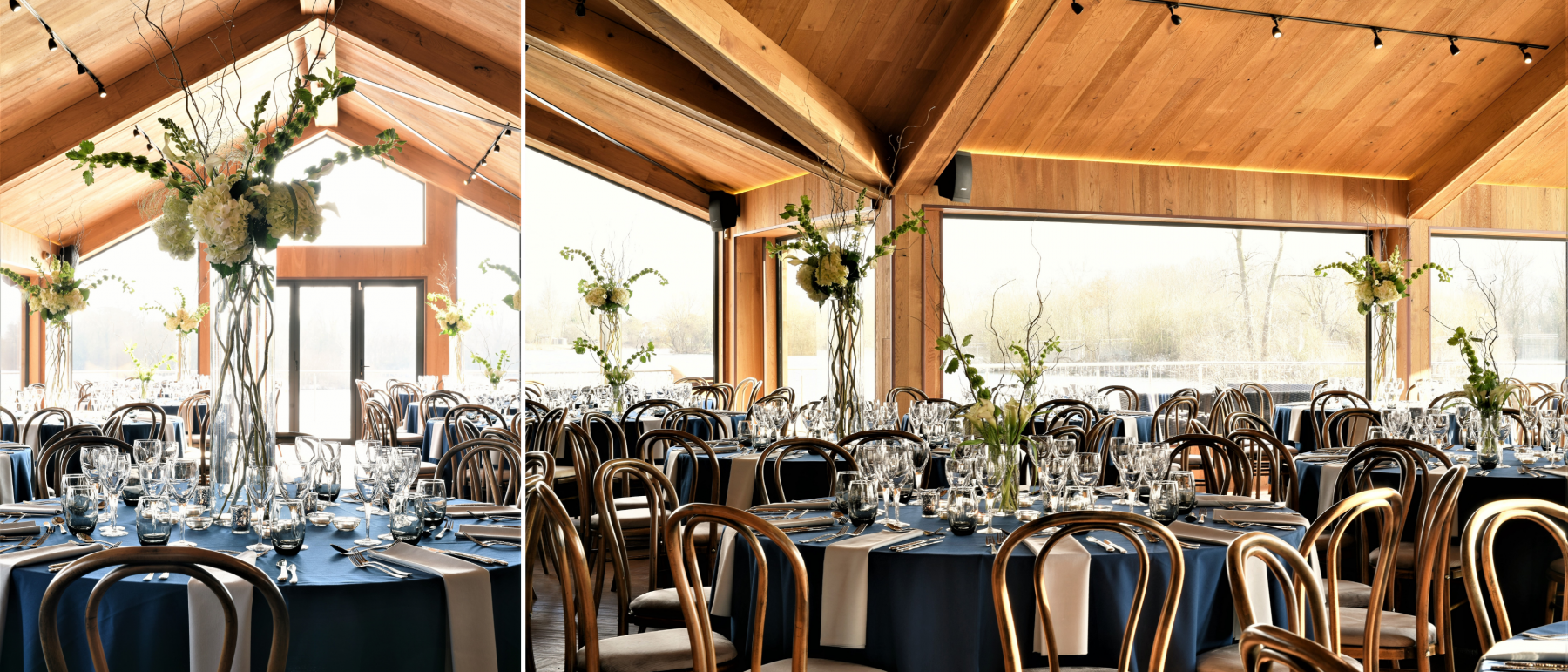 Amber Lakes, set between Heathrow Airport and Windsor is a stunning nature reserve with 120 acres of fishing lakes set around Amber Lodge, a Scandinavian lodge inspired events venue. For this shoot, we wanted to go simple and elegant, so a navy and grey colour scheme was chosen, teamed with our loop back chairs to mirror the natural wood used inside this venue.
