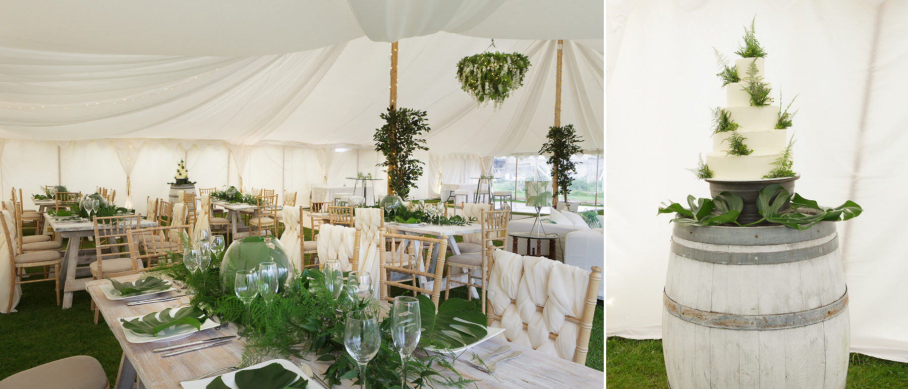 This was the year that white-wash was everywhere. Whereas now we are seeing a tendency towards natural wood finishes, there was a period of time where white-wash was very popular. For this marquee set up from House of Hud we teamed our white wash trestle tables up with our lime wash Chiavari chairs, which were finished with chair draping. The foliage abundant tables were laid up with simplicity plates and our silver Liza cutlery. At the time, even our barrels were white-washed!