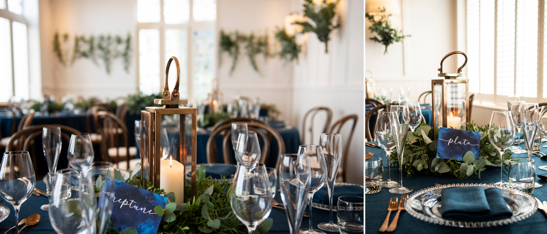 Set right on the seafront, Brighton Harbour Hotel is a stunningly simple blank canvas for whatever theme you want to create inside. We loved putting together this inky toned Indigo set up featuring our luxurious Urbane linen range of tablecloths and napkins. Clear glass beaded chargers and Vinoteque crystal glassware added the perfect ‘twinkle’, and the copper lanterns and planetary table names added a celestial essence.