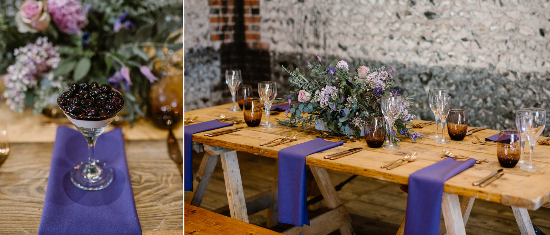 One of the wonderful things about styled shoots is the chance to showcase some of the less-commonly chosen colours. Here we were thrilled at the opportunity to show off our Purple Signature napkins at Cissbury Barns, which show up beautifully against a rustic wooden backdrop. Our vintage trestle tables were partnered with rustic benches for an elegant, but rustic look.