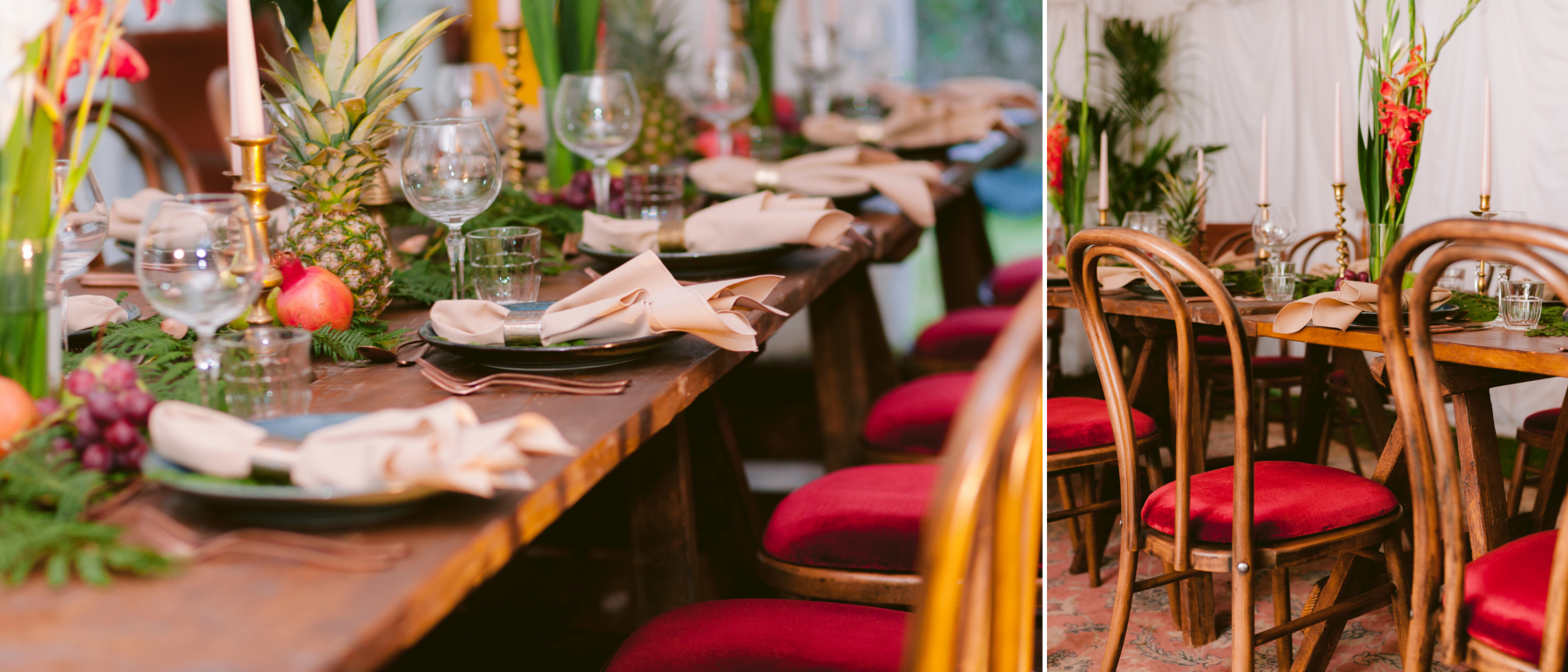 What a different shoot this one was. The very talented Deco Noir wanted to put together a shoot to showcase their ‘Raj Tent’, and so this elegant exotic styled shoot was born, featuring our dark wood trestle tables and loop back chairs. Colour was used everywhere… Deep red seat pads, coloured stoneware plates and copper cutlery were used and the tables were adorned with Pineapples and Pomegranates to really take you out of England!