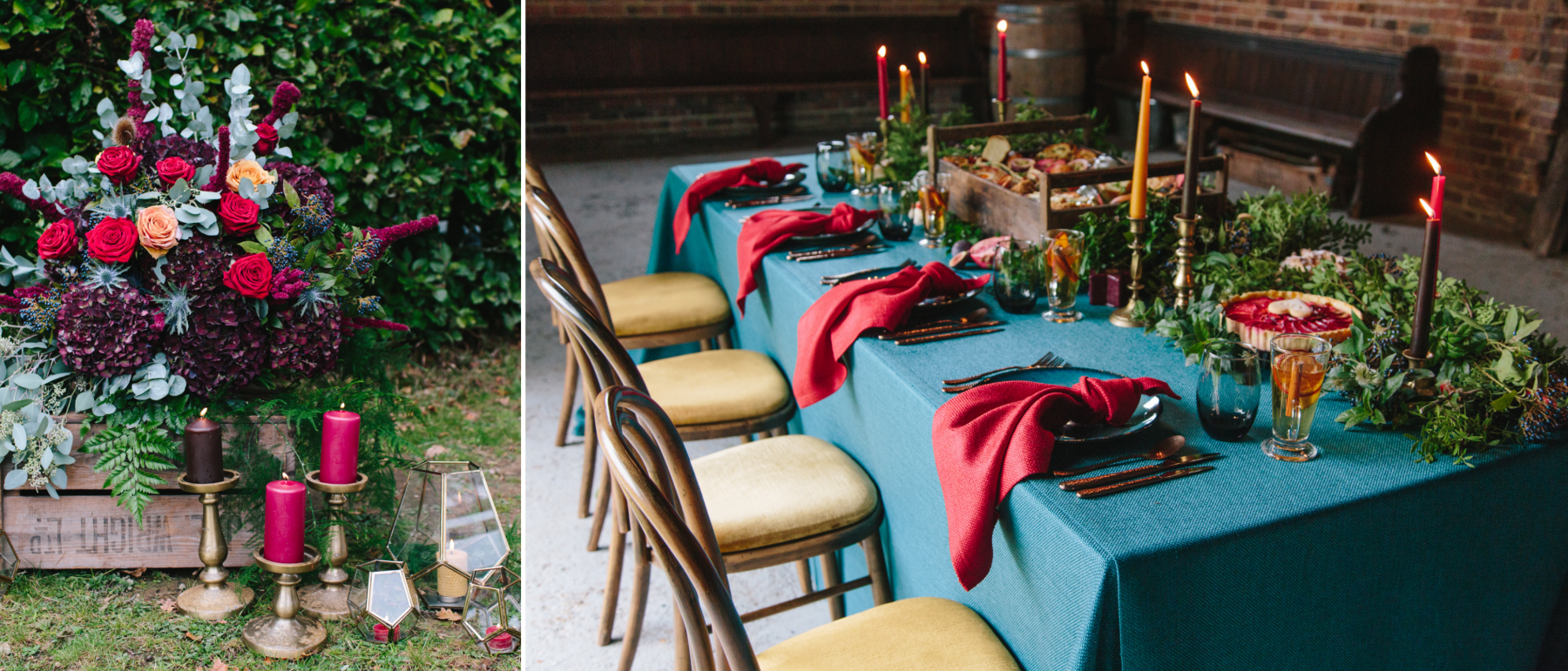 This deep, rich autumnal shoot was put together to showcase a new venue (not yet open to the public). A wonderful group of suppliers came together to create this warm, rustic, feasting table set up, perfect for small intimate parties in a rural barn. Luxurious linens were teamed up with an array of autumnal flowers and an abundance of candles, finished with a feasting box from The Garden Chef for the guests to enjoy.